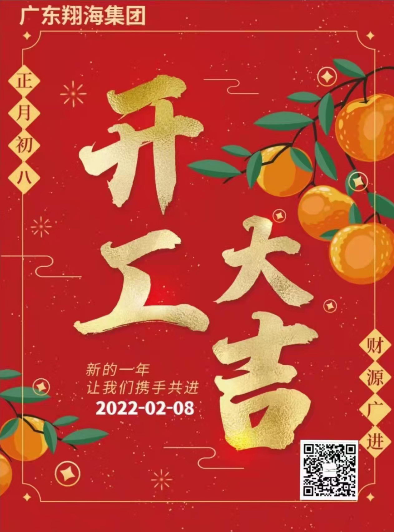 正月初八,广东翔海集团恭祝各界同仁开工大吉,万事如意,生意兴隆,财源广进! 新年伊始,让我们怀着饱满热情,众志成城,披荆斩棘,砥砺前行,再创佳绩!